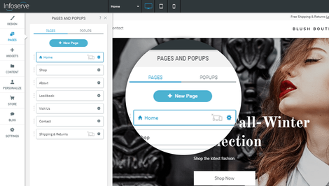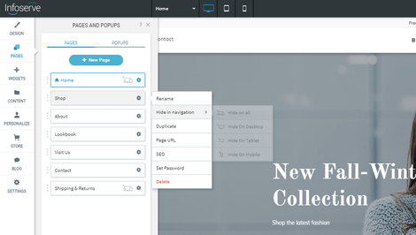 On the right side of each page name there is a cog icon, if you click this icon it will open more options for you to choose from, you can select which devices you would like the page to be shown on the navigation and which devices you would like it to be hidden on.