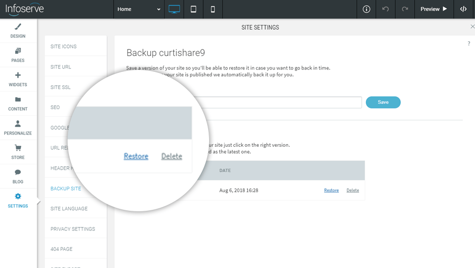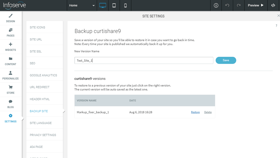 The first thing you want to do is head to the 'settings' section of the editor, once pressed it will open up a side window with more options, you want to select backup site.