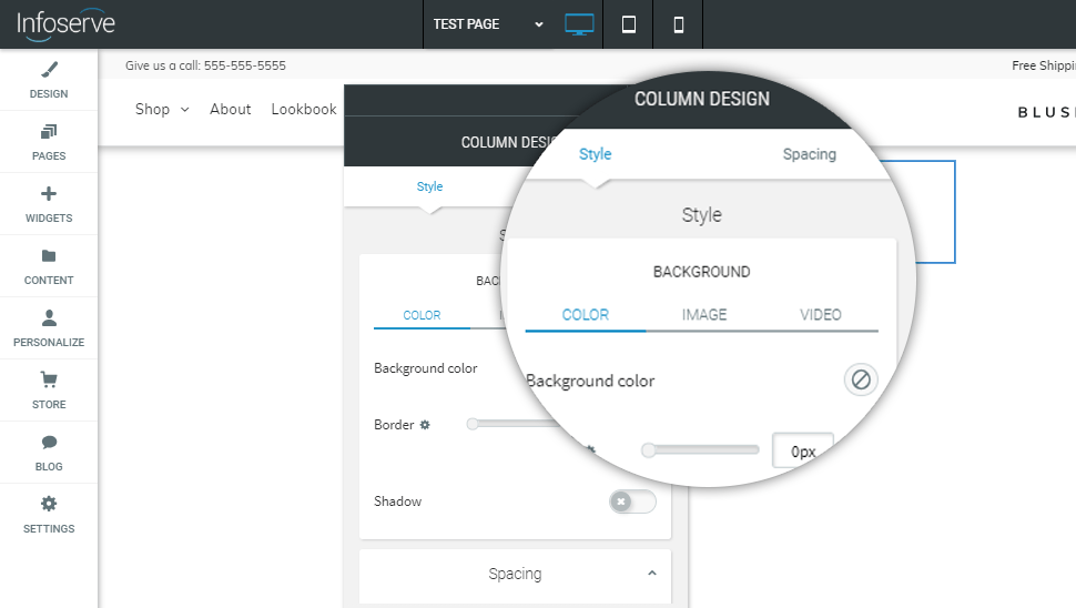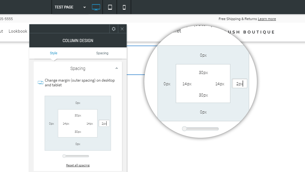 If you select the 'spacing' tab within the pop up you will see the below screen, this is where you can change the padding and margin of the chosen section. Margin is changed on the outer ring and padding is the inner values.